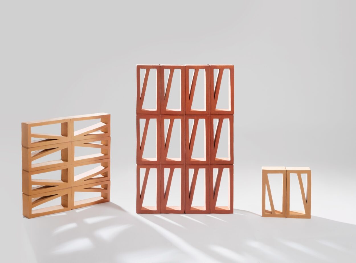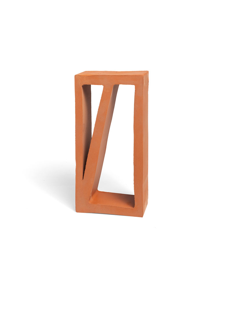 Peça ceràmica de forma rectangular amb una partició asimètrica en el seu interior convida a crear gelosies amb patrons molt variats.